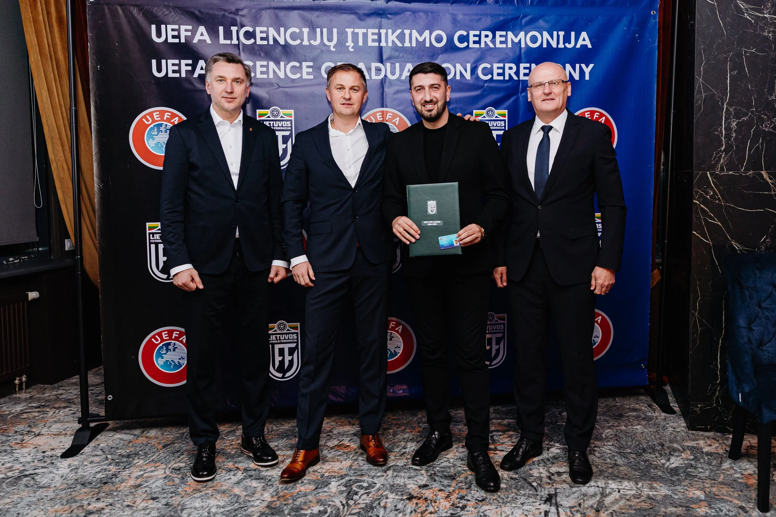 Zurab Amirian receives his UEFA Pro Licence diploma during the graduation ceremony, pictured with Deividas Šemberas, Daniel Wimmer, and Valdas Urbonas.